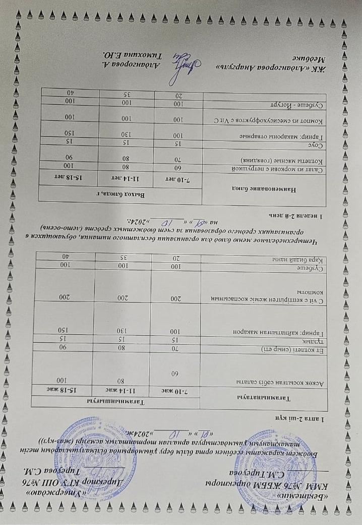 01 октябрь 2024 0 1 2 3 4 5 1-4 сынып, 5-11 сынып ХӘОТ мәзірі. Жаз-күз 2024 жыл. / Меню 1-4 кл, 5-11 кл СУСН. Лето-осень 2024.