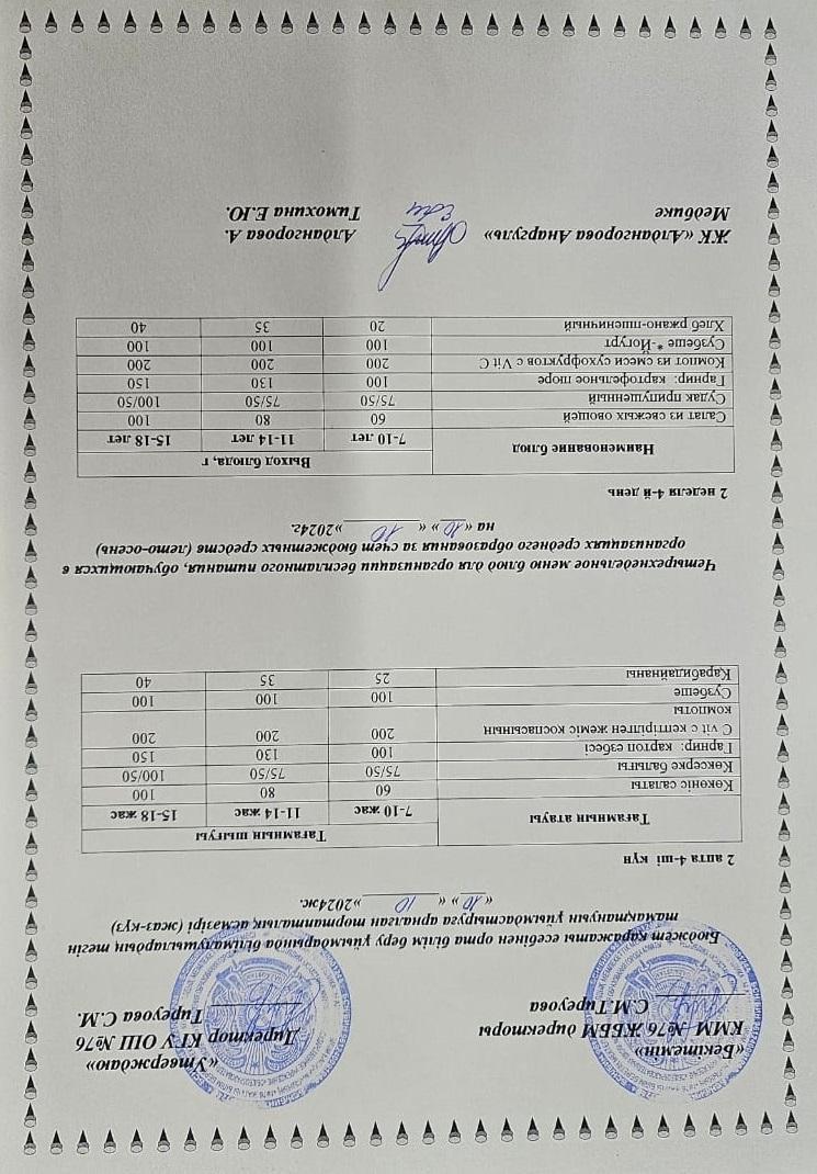 10 октябрь 2024 0 1 2 3 4 5 1-4 сынып, 5-11 сынып ХӘОТ мәзірі. Жаз-күз 2024 жыл. / Меню 1-4 кл, 5-11 кл СУСН. Лето-осень 2024.
