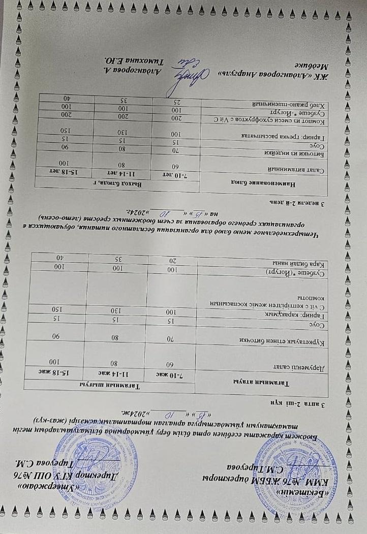 15 октябрь 2024 0 1 2 3 4 5 1-4 сынып, 5-11 сынып ХӘОТ мәзірі. Жаз-күз 2024 жыл. / Меню 1-4 кл, 5-11 кл СУСН. Лето-осень 2024.