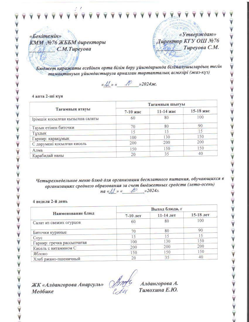 22 октябрь 2024 0 1 2 3 4 5 1-4 сынып, 5-11 сынып ХӘОТ мәзірі. Жаз-күз 2024 жыл. / Меню 1-4 кл, 5-11 кл СУСН. Лето-осень 2024.