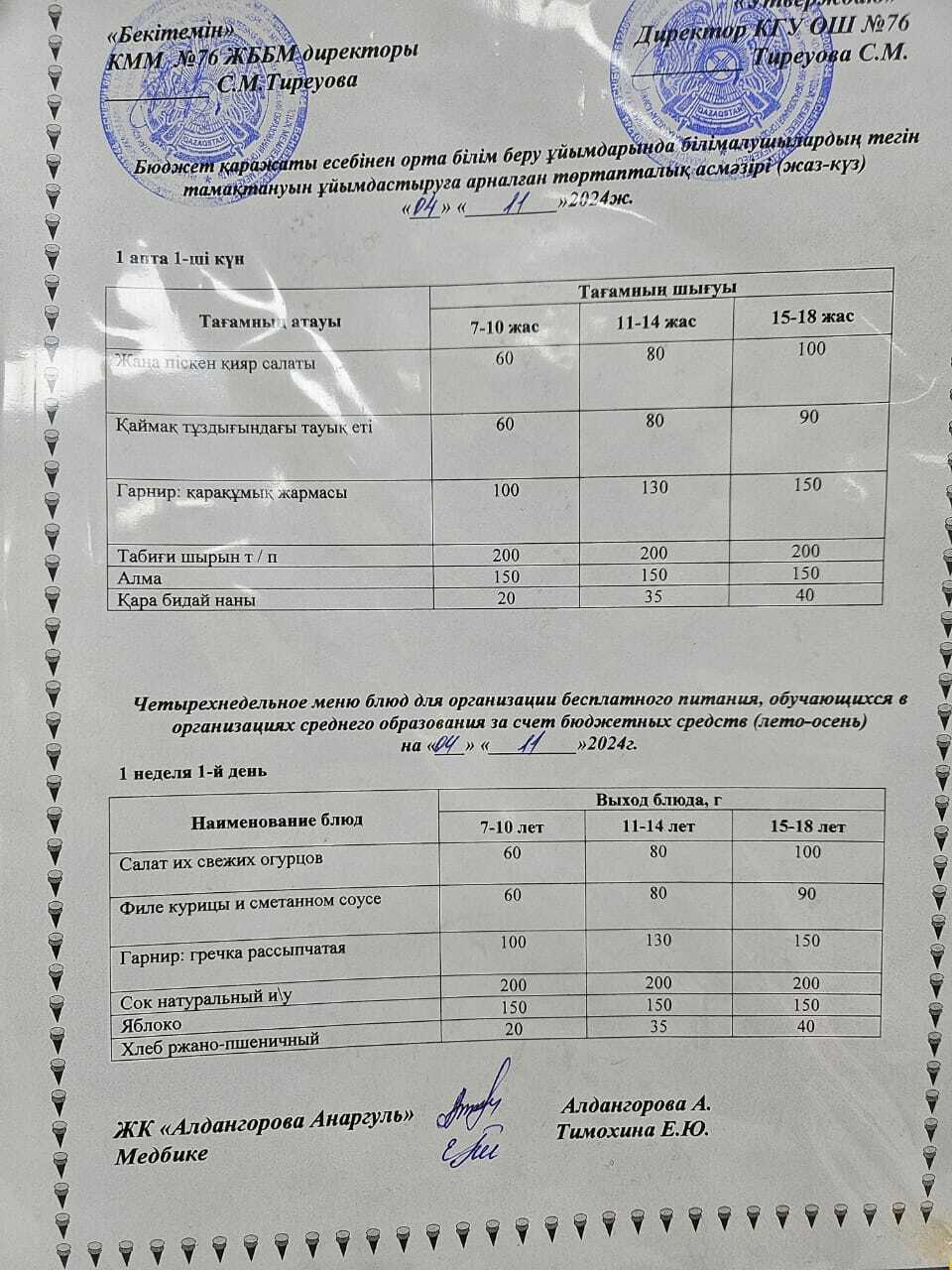 04 ноябрь 2024 0 1 2 3 4 5 1-4 сынып, 5-11 сынып ХӘОТ мәзірі. Жаз-күз 2024 жыл. / Меню 1-4 кл, 5-11 кл СУСН. Лето-осень 2024.
