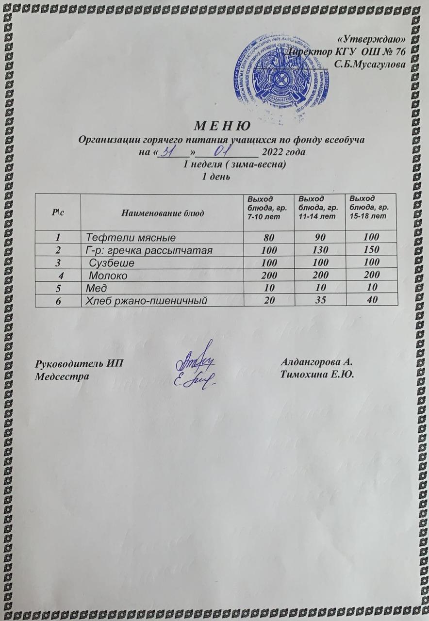31 январь 2022 0 1 2 3 4 5 Жалпы білім беру бойынша күнделікті ыстық тамақ мәзірі 1 апта (қыс-көктем) 1-ші күн, Ежедневное меню горячего питания по всеобучу 1 неделя (зима-весна) 1 день
