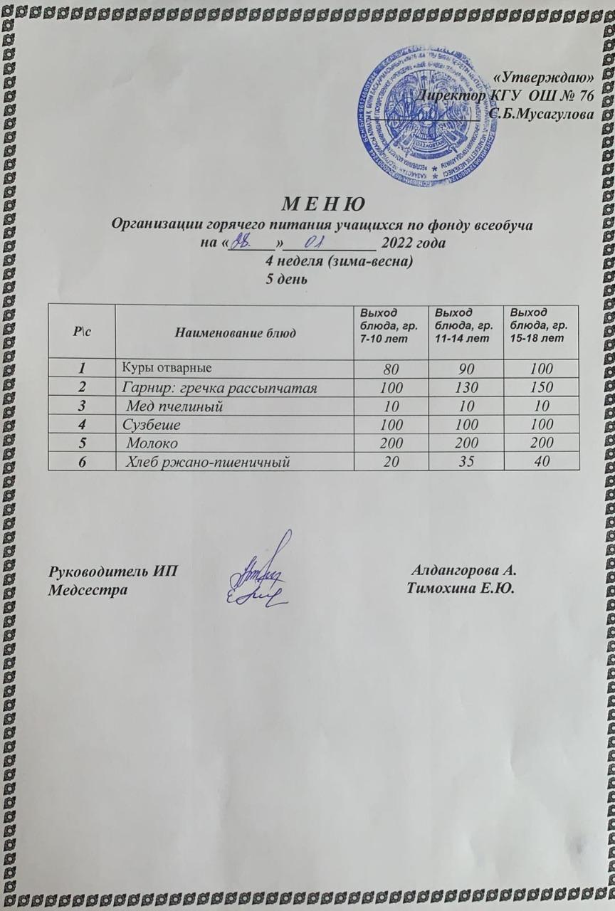 28 январь 2022 0 1 2 3 4 5 Жалпы білім беру бойынша күнделікті ыстық тамақ мәзірі 4 апта (қыс-көктем) 5-ші күн, Ежедневное меню горячего питания по всеобучу 4 неделя (зима-весна) 5 день