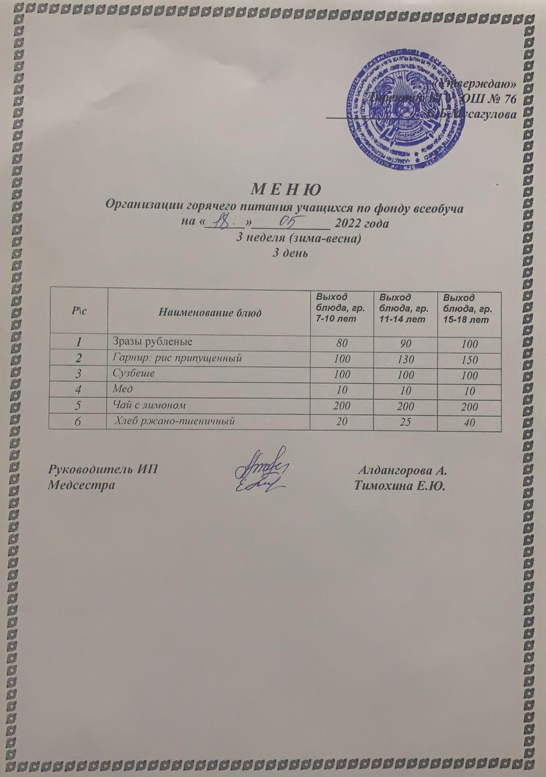18 май 2022 0 1 2 3 4 5 Жалпы білім беру бойынша ыстық тамақтың күнделікті мәзірі 3 апта (қыс-көктем) 3 күн. Ежедневное меню горячего питания по всеобучу 3 неделя (зима-весна) 3 день
