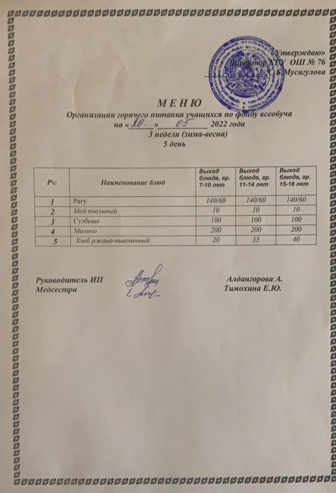 20 май 2022 0 1 2 3 4 5 Жалпы білім беру бойынша ыстық тамақтың күнделікті мәзірі 3 апта (қыс-көктем) 5 күн. Ежедневное меню горячего питания по всеобучу 3 неделя (зима-весна) 5 день
