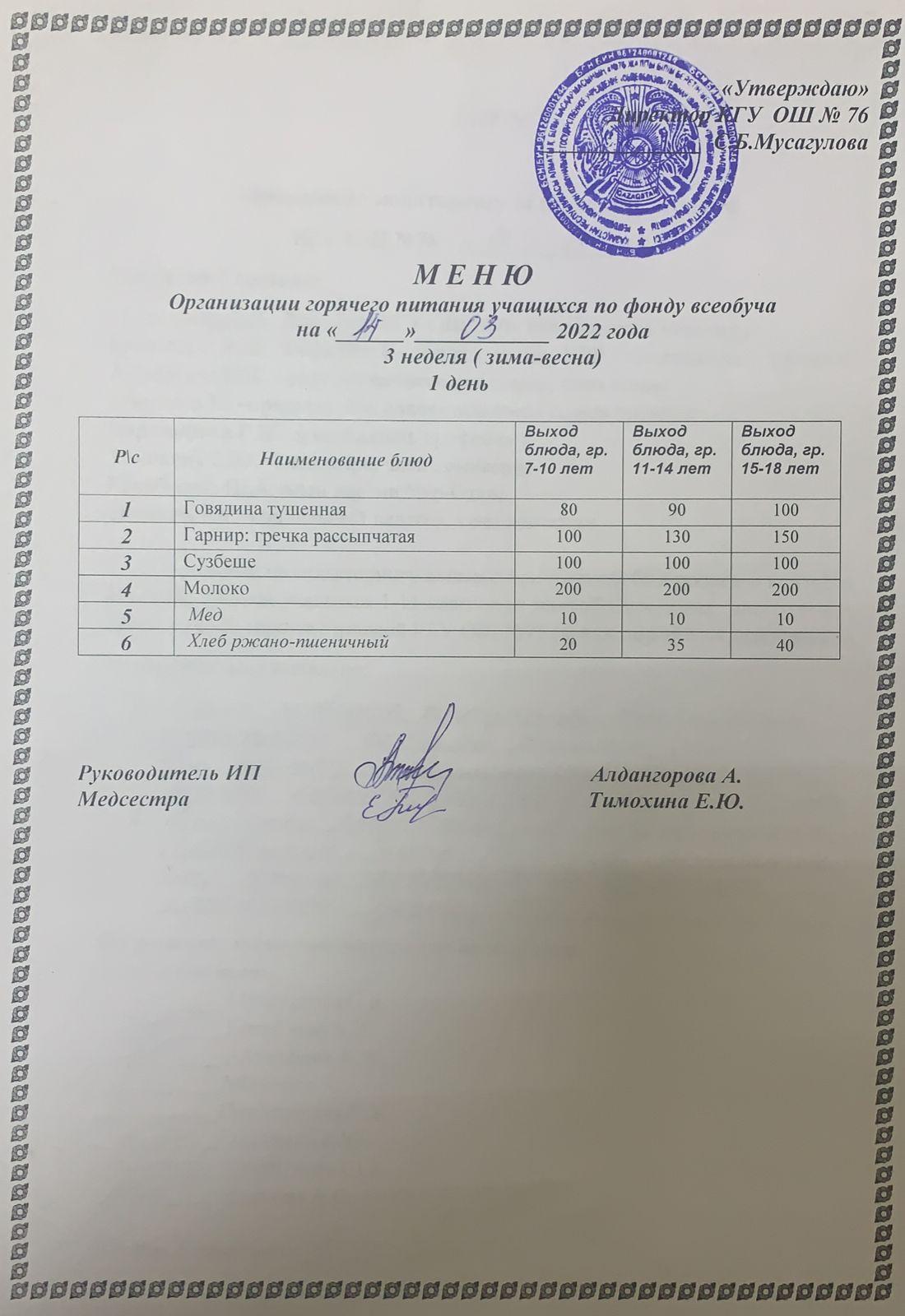14 март 2022 0 1 2 3 4 5 Жалпы білім беру бойынша ыстық тамақтың күнделікті мәзірі 3 апта (қыс-көктем) 1 күн, Ежедневное меню горячего питания по всеобучу 3 неделя (зима-весна) 1 день