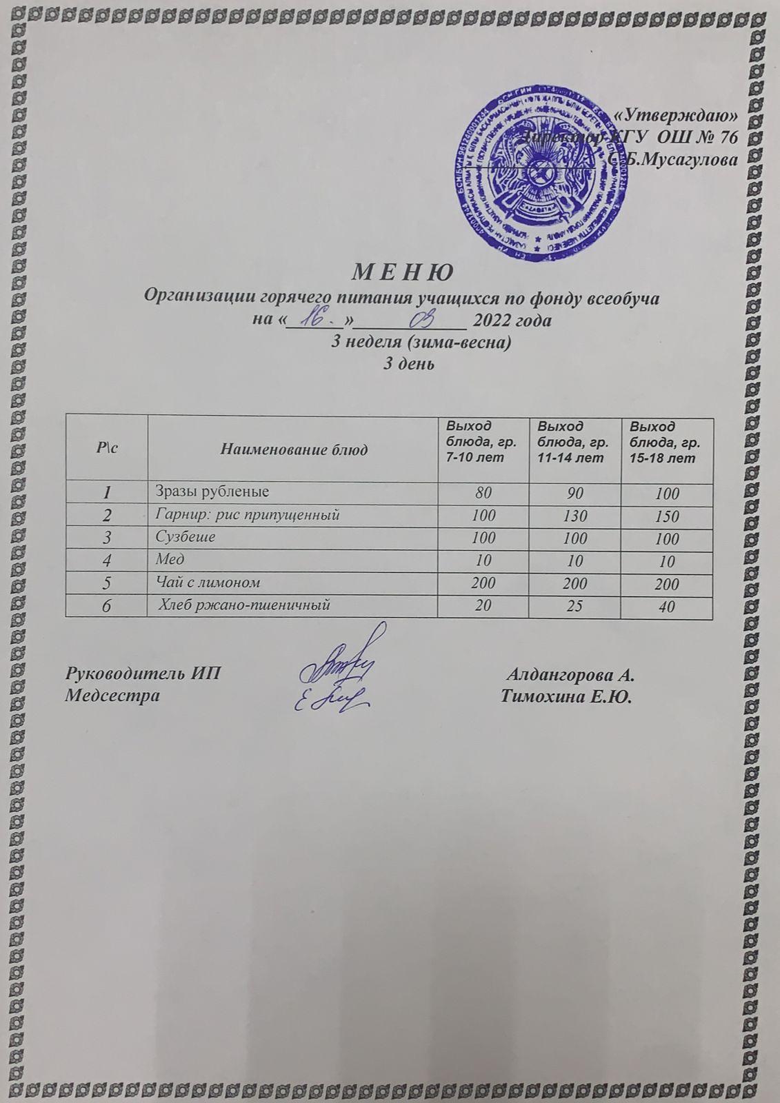 16 март 2022 0 1 2 3 4 5 Жалпы білім беру бойынша ыстық тамақтың күнделікті мәзірі 3 апта (қыс-көктем) 3 күн, Ежедневное меню горячего питания по всеобучу 3 неделя (зима-весна) 3 день