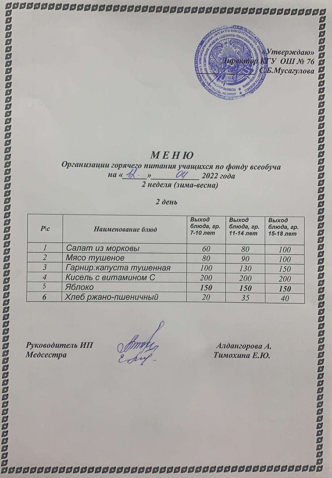 12 апрель 2022 0 1 2 3 4 5 Жалпы білім беру бойынша күнделікті ыстық тамақ мәзірі 2 апта (қыс-көктем) 2 күн. Ежедневное меню горячего питания по всеобучу 2 неделя (зима-весна) 2 день