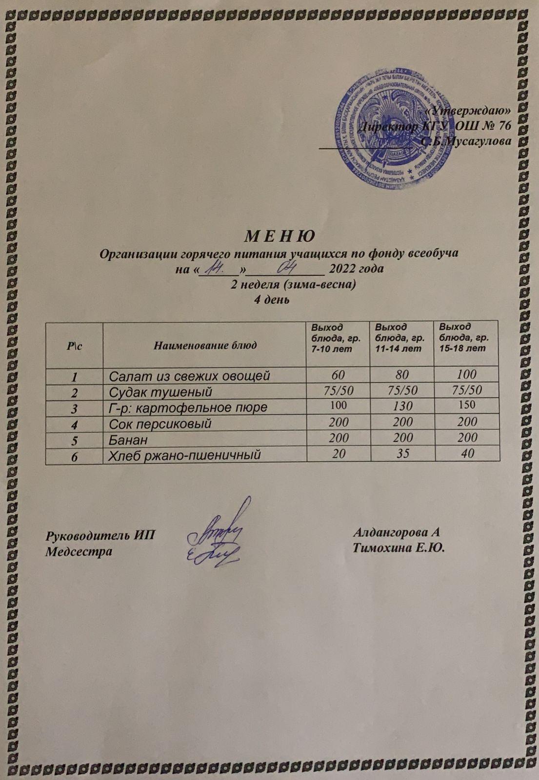 14 апрель 2022 0 1 2 3 4 5 Жалпы білім беру бойынша күнделікті ыстық тамақ мәзірі 2 апта (қыс-көктем) 4 күн. Ежедневное меню горячего питания по всеобучу 2 неделя (зима-весна) 4 день