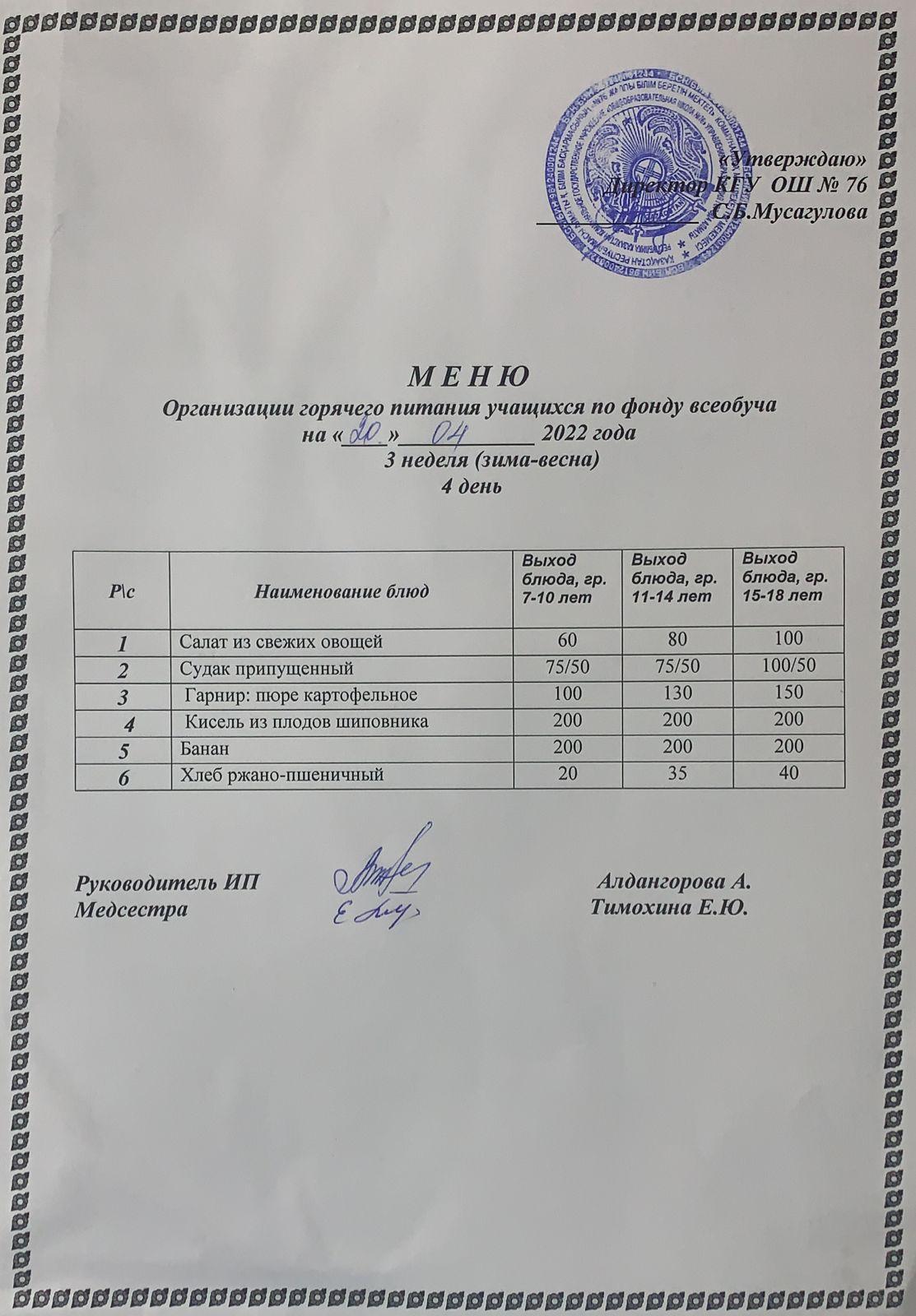 21 апрель 2022 0 1 2 3 4 5 Жалпы білім беру бойынша күнделікті ыстық тамақ мәзірі 3 апта (қыс-көктем) 4 күн. Ежедневное меню горячего питания по всеобучу 3 неделя (зима-весна) 4 день