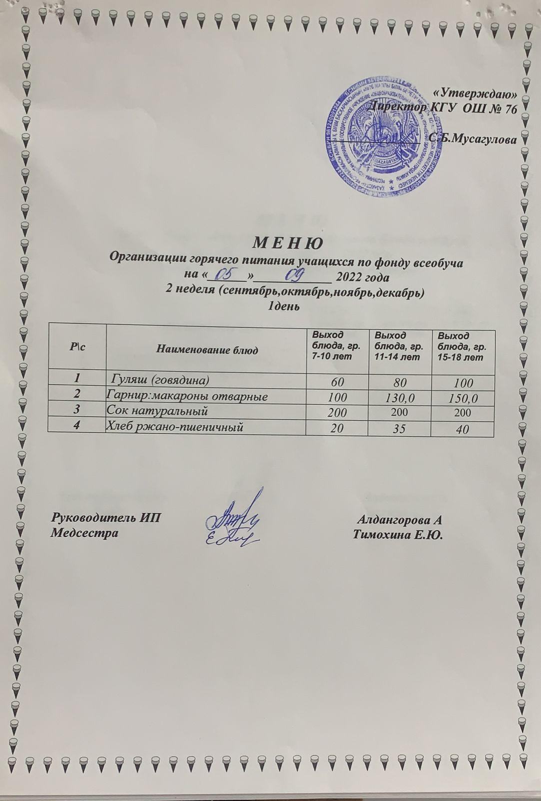 Бюджет қаражаты есебінен орта білім беру ұйымдарында оқушыларды тегін тамақтандыруды ұйымдастыруға арналған төрт апталық тағамдар мәзірі.( қыркүйек, қазан, қараша, желтоқсан)