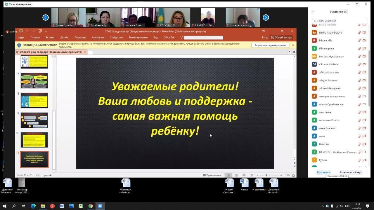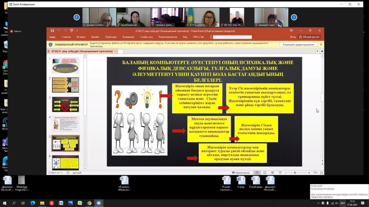 27 февраль 2021 0 1 2 3 4 5 «Директорлық сенбі – ата-ана үні». «Директорская суббота – голос родителей» 27.02.2021 год На онлайн - встрече кратко обсуждались вопросы. Профилактика интернет зависимости подростков.Итоговая аттестация учащихся и подготовка к ЕНТ. Родители вырозили свою багодарность, одоброли и поддержали поднятые вопросы администрацией школы.