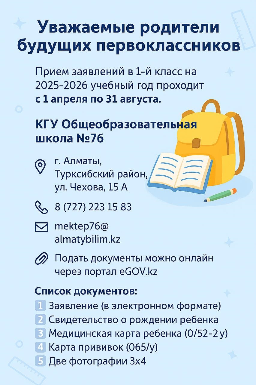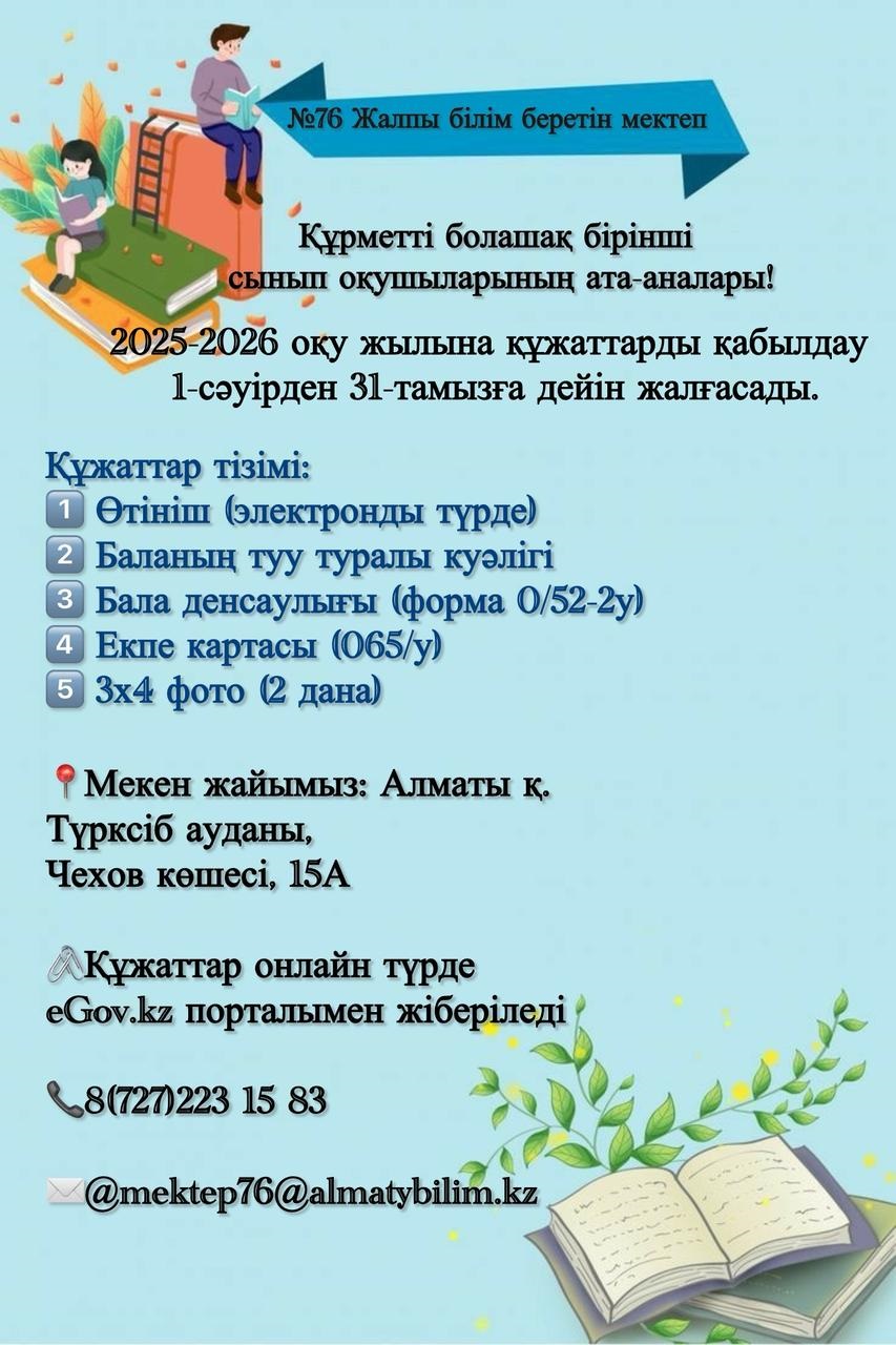 01 апрель 2025 0 1 2 3 4 5 2025-2026 оқу жылына 1-сыныпқа оқушыларды қабылдау 1-сәуірден 31 тамызға дейін жалғасады.